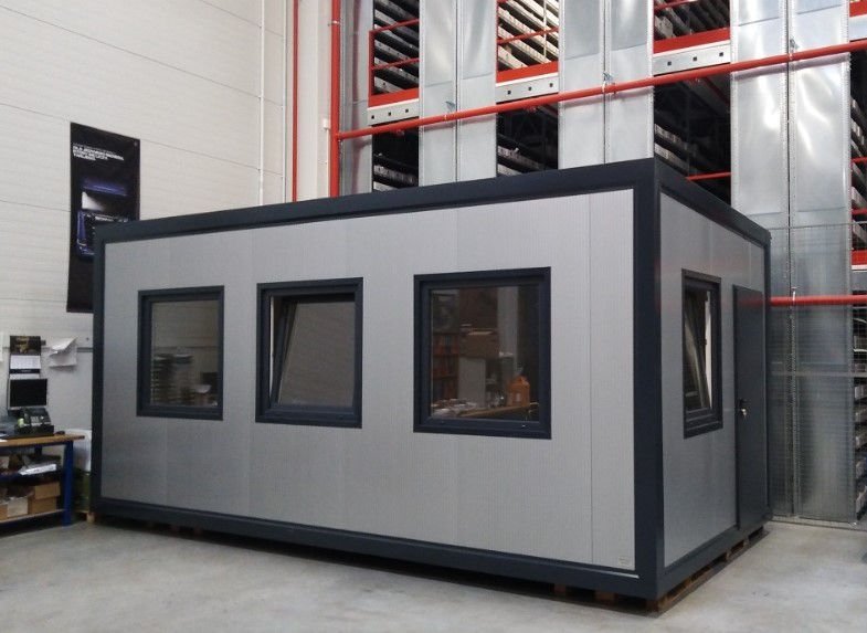 Contentor Escritório modular de 18 m² com isolamento de 100mm, ideal para uso todo o ano. Inclui instalação elétrica, aquecimento e ventilação. Estrutura robusta e móvel, pronta a instalar para um espaço de trabalho funcional.