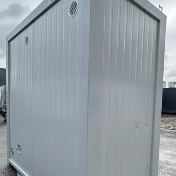 A construção utiliza painéis sandwich impermeáveis e isolados, juntamente com uma estrutura em aço reforçado, garantindo durabilidade, robustez e um excelente isolamento térmico e acústico. Estes materiais são projetados para resistir ao uso prolongado e às condições ambientais, requerendo pouca manutenção.