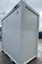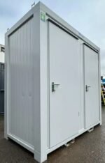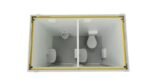 Este contentor sanitário duplo é inteligentemente dividido em duas cabines separadas, cada uma com acesso direto pelo exterior. Um compartimento destina-se a WC e o outro a Urinol. O design interior foca-se na privacidade e higiene individual, apesar das dimensões compactas. Cada cabine está equipada com as instalações essenciais, incluindo água quente, aquecimento e ventilação, tornando a unidade confortável e prática em diversas condições.