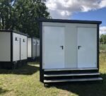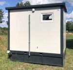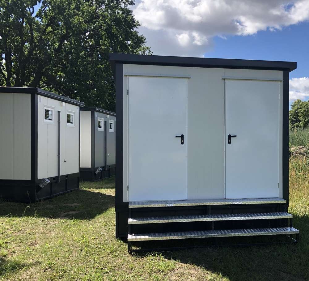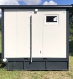 Contentor sanitário de 3×2 metros com WC, duche e tanque de águas residuais integrado. Solução isolada (80mm), equipada com instalações elétricas e aquecimento. Pronto a ligar, ideal para locais sem acesso a esgotos.