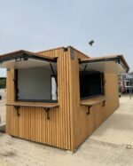 Base de apoio alta com estrutura tubular, revestida com chapa ondulada, revestida com madeira IDRO V100 de 18 mm de espessura, revestida com PVC antiderrapante.